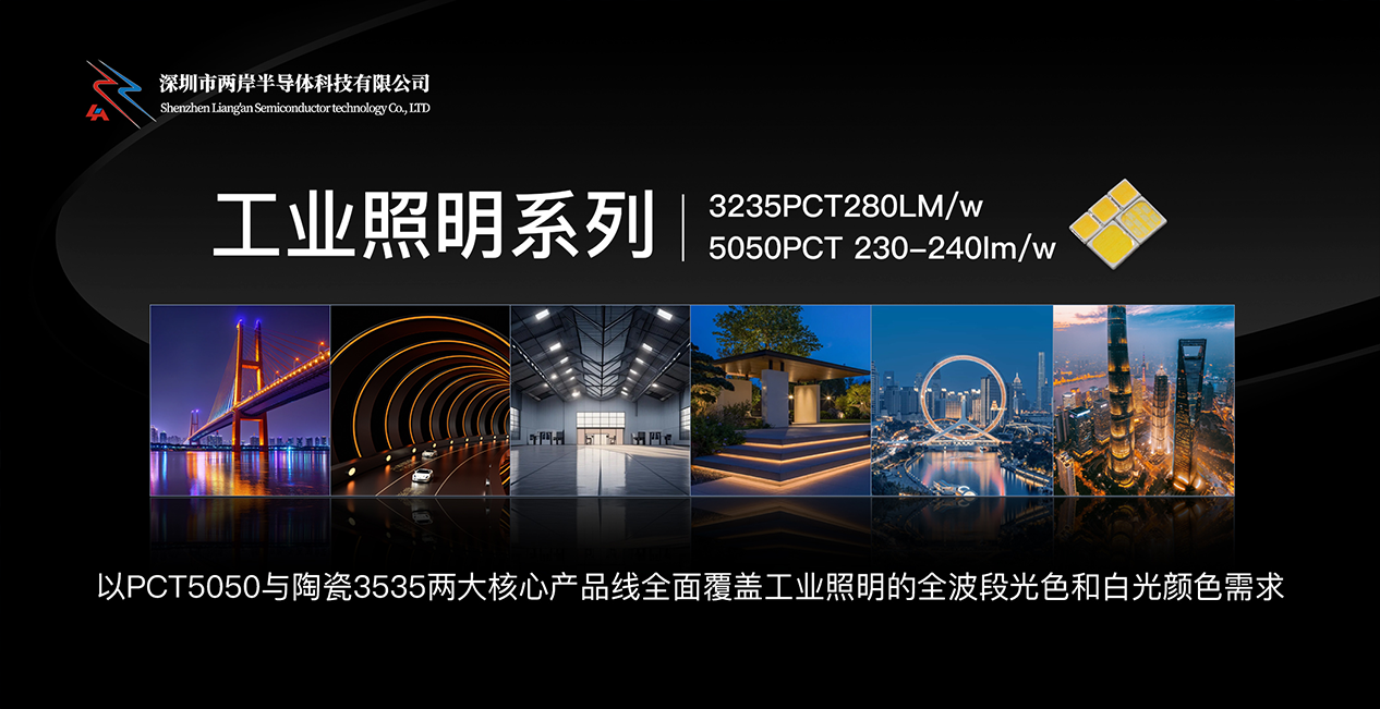兩岸半導體有限公司深耕工業(yè)照明領(lǐng)域,以PCT5050與陶瓷3535兩大核心產(chǎn)品線全面覆蓋工業(yè)照明的全波段光色和白光顏色需求。其中PCT5050系列表現(xiàn)尤為突出,PCT5050以高性價比普及高效節(jié)能,通過成熟的技術(shù)和材料,實現(xiàn)了優(yōu)異的成本控制。其光效已達到行業(yè)領(lǐng)先水平,單顆光源出光效率可達230-240lm/w ( 45mA /22-23V),能夠幫助工業(yè)項目替代老舊高耗能燈具,實現(xiàn)節(jié)能80%。通過集成化拓展智能與多功能場景,應用于各種照明場景,也可以將紅、綠、藍三種芯片集成于一顆5050燈珠內(nèi),能夠輕松實現(xiàn)全彩變化、色溫調(diào)節(jié)和智能控制,為工業(yè)照明中需要氛圍指示、分區(qū)照明或與智能管理系統(tǒng)聯(lián)動的場景提供了高性價比的解決方案。